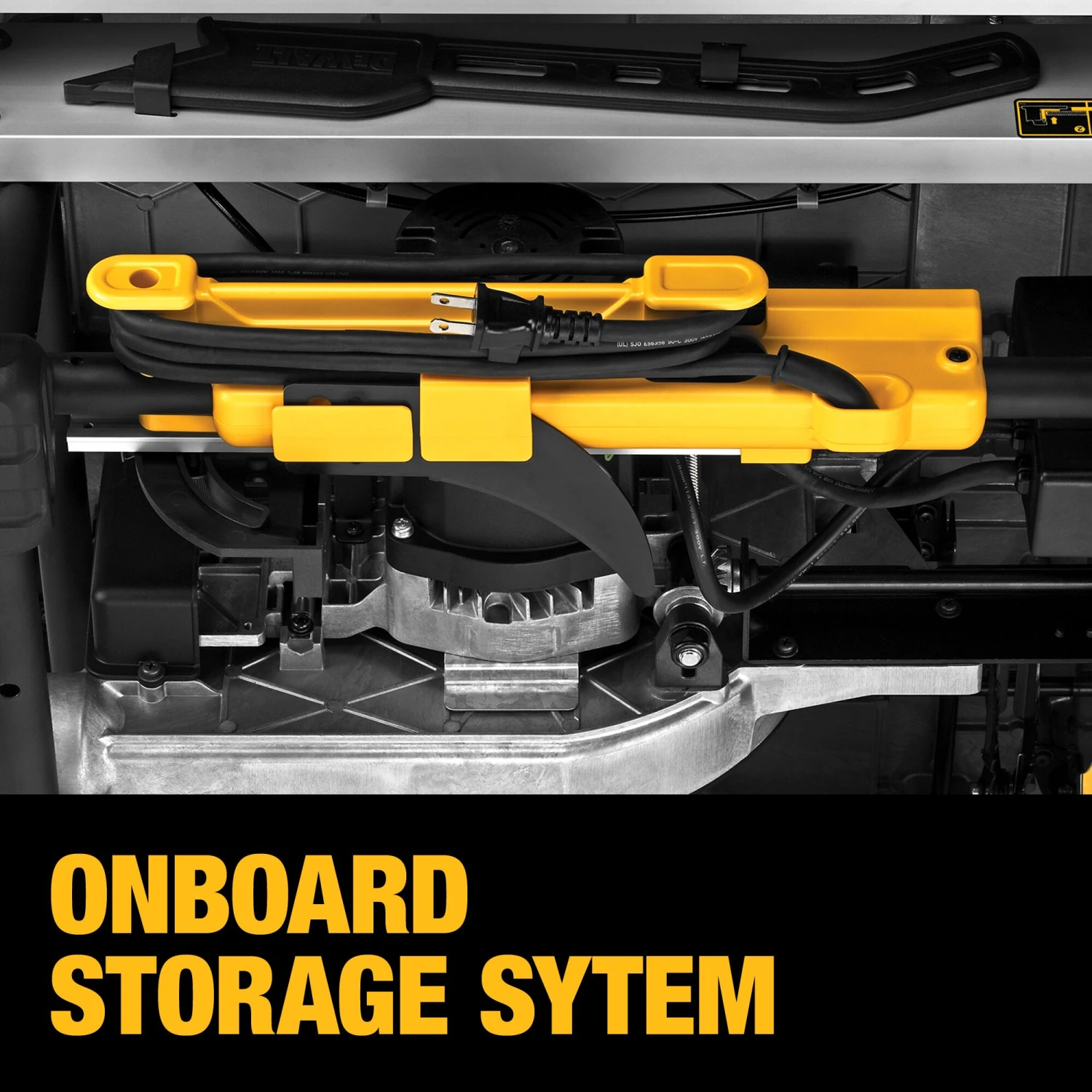 Onboard storage system provides easy access to the Blade Guard Assembly, fence, riving knife, miter gauge, wrenches, push stick, and cord wrap when not in use