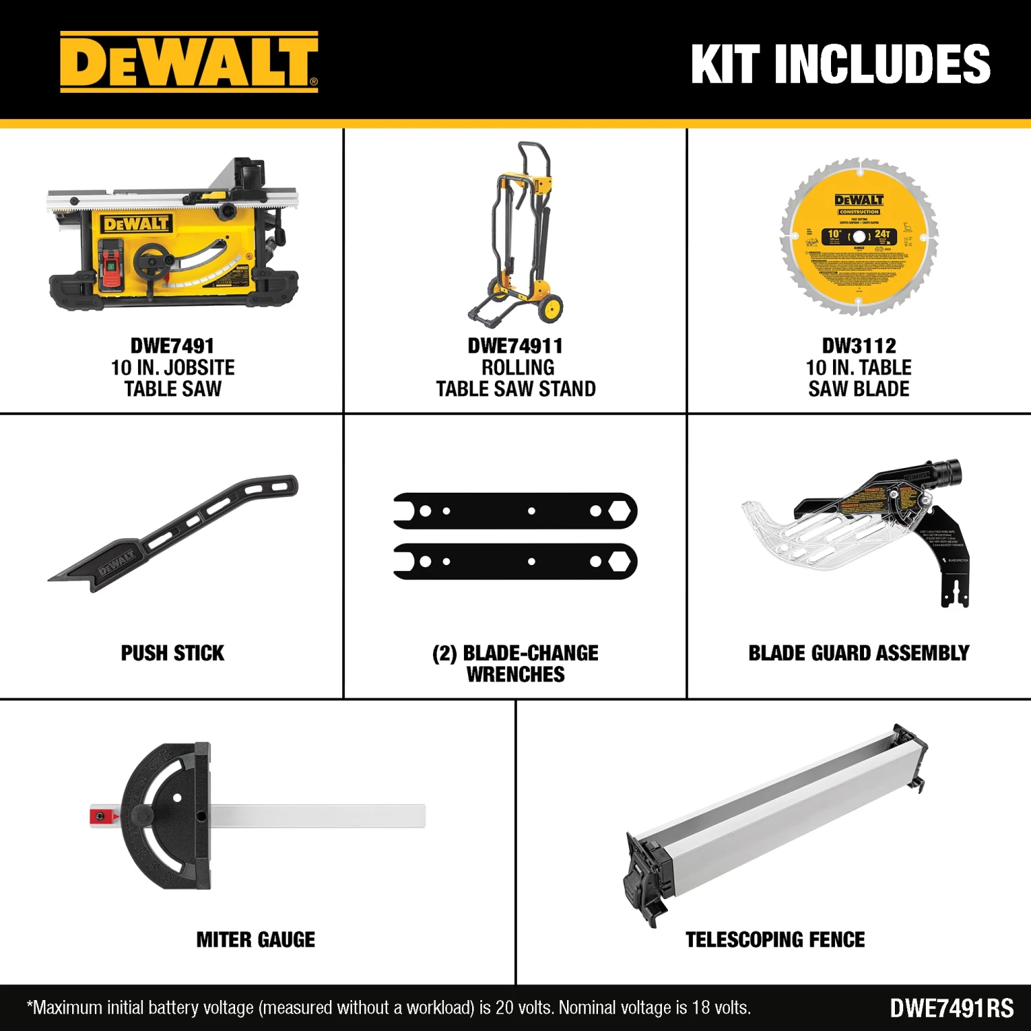 The DWE7491RS 10″ Jobsite Table Saw 32 – 1/2″ Rip Capacity, and a Rolling Stand has a 15 Amp motor and 32-1/2″ rip capacity to allow cutting of large and hardwood materials. Features tool-free guarding component adjustments and fast, accurate fence adjustments. Rolling stand designed for easy set up and breakdown with excellent stability.