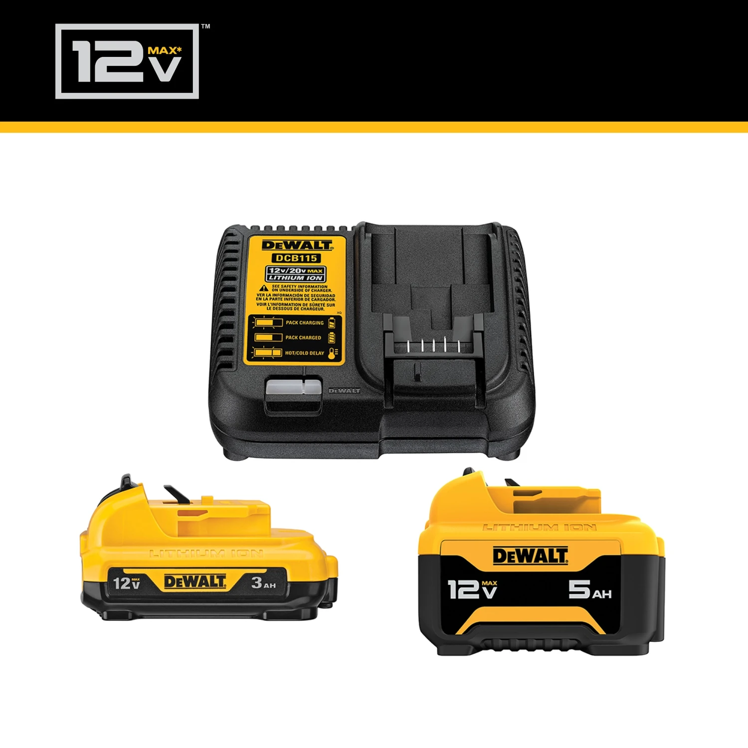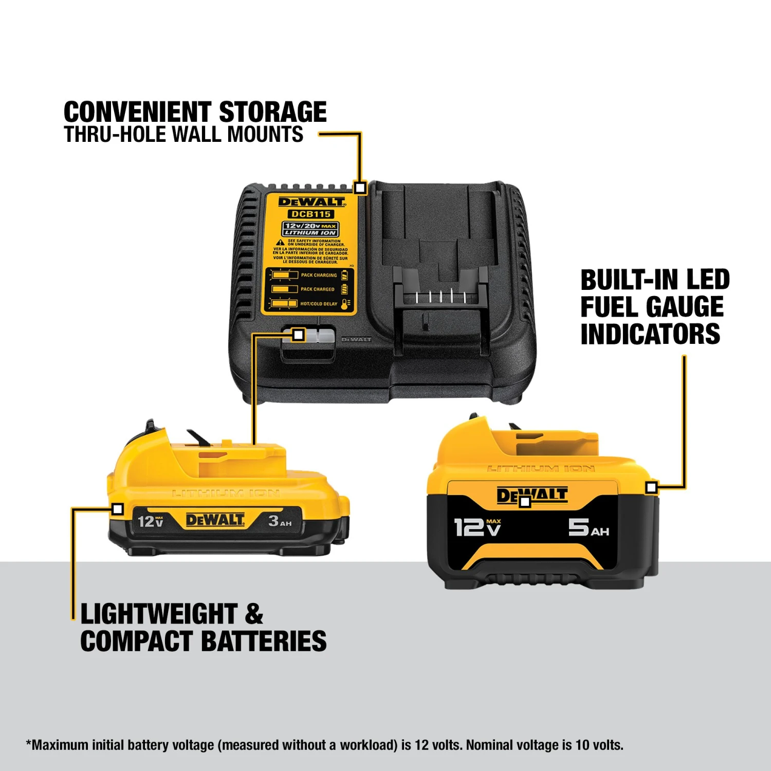 Get the most out of your 12V MAX* tools on the jobsite with this 12V MAX* Battery Starter Kit. The kit includes 2 high-capacity 12V MAX* batteries—one 5.0Ah (DCB126) and one 3.0Ah (DCB124). Both batteries are lightweight, compact, and designed to deliver long runtime. Keep aware of the state of charge of each battery and avoid unplanned work stoppages using their built-in LED fuel gauge indicators. Engineered to help minimize charge time, the included DCB115 charger fuels your batteries quickly with its 4 Amp charge rate. The charger is wall-mount capable and compatible with all DEWALT® 12V MAX*, 20V MAX*, and FLEXVOLT® batteries.