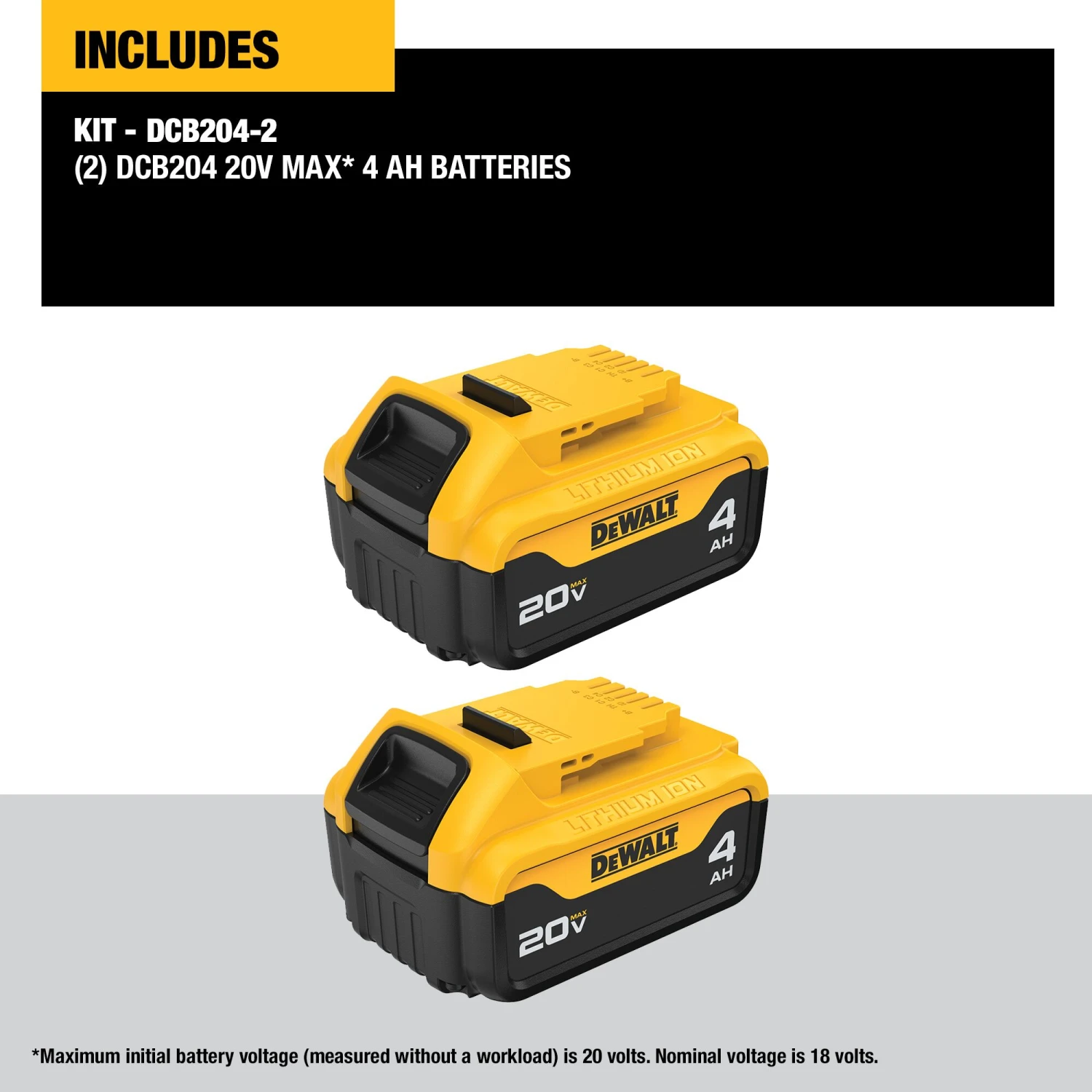 The DCB204-2 20V MAX* Lithium Ion 2-Pack provides immediate feedback on state of charge with the 3-LED Fuel Gauge System. DEWALT 20V MAX* battery has a lightweight design for easy transporting.