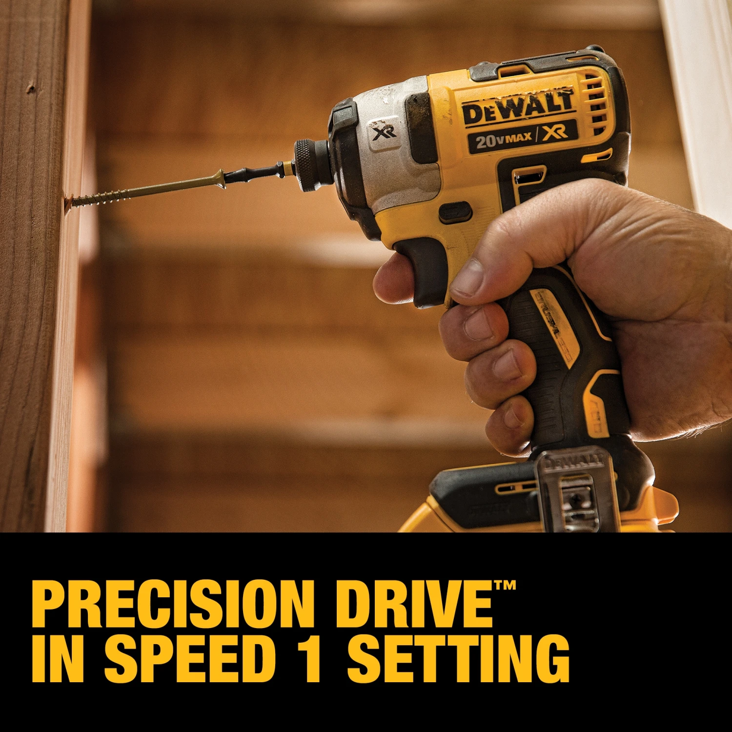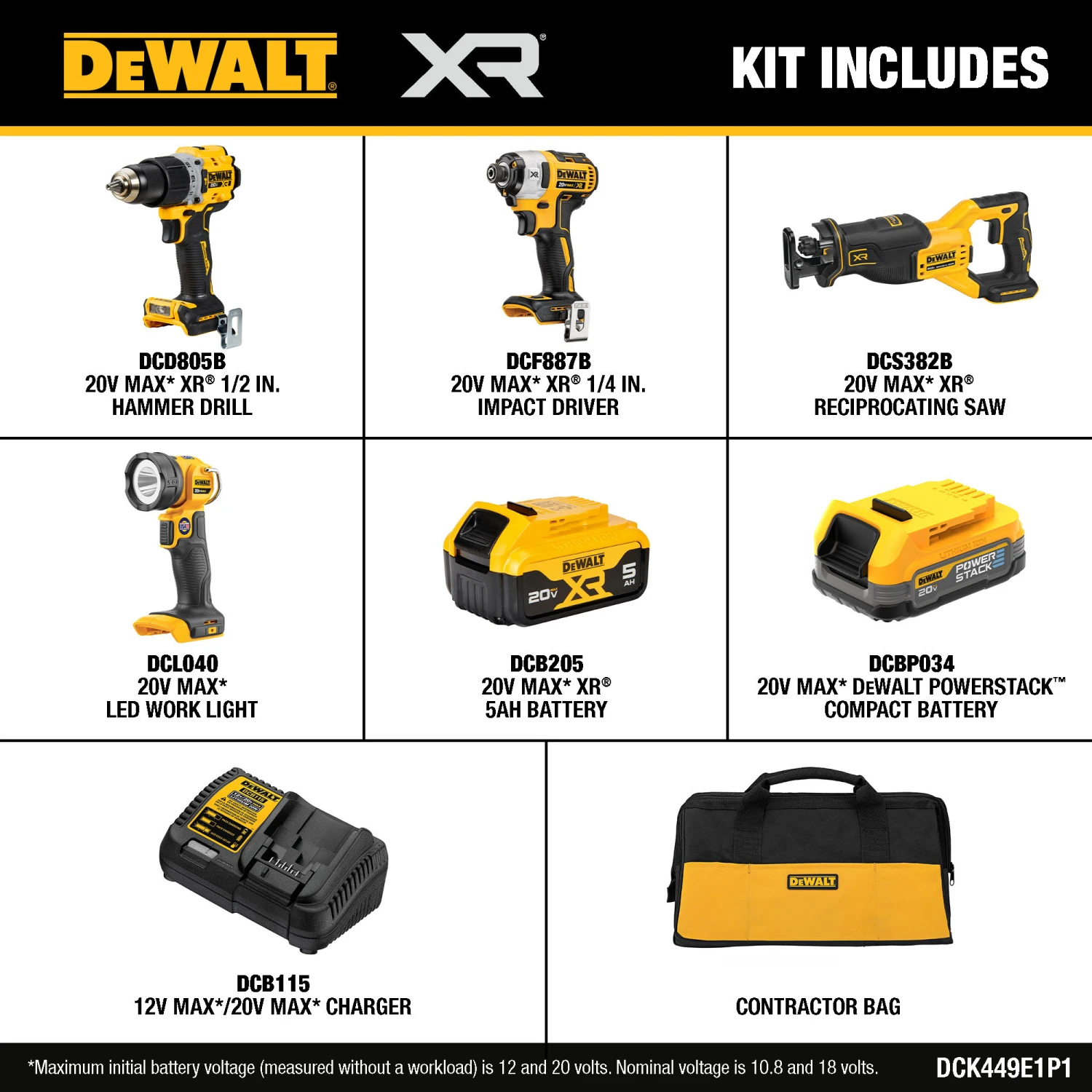 This 20V MAX* XR® Brushless Cordless Combo Kit includes 4 tools, two 20V MAX* batteries, charger, and kit bag. The DCD805, 1/2-in Drill/Driver is designed to help you complete demanding fastening and drilling projects, this 20V MAX* XR® Brushless 1/2-in Hammer Drill/Driver delivers the durability and performance professionals need on jobsite. Quickly drive fasteners into thick material with its powerful brushless motor, which outputs up to 40% more Unit Watts Out compared to DCD796B using DCB205 battery or DCBP034 DEWALT® POWERSTACK™ compact battery. DCD805 will help you Speed through masonry drilling applications with up to 34,000 bpm thanks to an integrated hammer mode function. Both Tools are equipped with LED lights for better visibility, The 3-position pivoting LED on the Drill Driver is designed to enhance visibility in dimly lit work areas with its 3 mode settings and up to 70 Lumens of brightness. The 1/4-in Brushless Cordless 3-Speed Impact Driver Compact size (5.3-in front-to-back length) and lightweight (3.4 lb) design for working in confined spaces. Though the Impact Driver is lightweight and compact in size, it does not sacrifice performance with its brushless motor that delivers up to 1,825 in-lb of torque and 3,250 rpm for driving large-diameter screws. The DCS382 Reciprocating Saw has a stroke length of 1-1/8-in and a variable-speed trigger delivering up to 2,900 strokes per min helping you cut through any job. The DCL040 LED Work Light has a bright output of up to 110 lumens to illuminate your work surface. This kit is backed by a 3-year, limited warranty so you can buy with confidence. This cordless kit includes one of our most powerful, most compact, and lightest weight 20V MAX* battery, with 50% more power, 25% more compact, and 15% less weight than the DCB203. The DEWALT® POWERSTACK™ compact battery works with all DEWALT® 20V MAX* power tools and chargers.