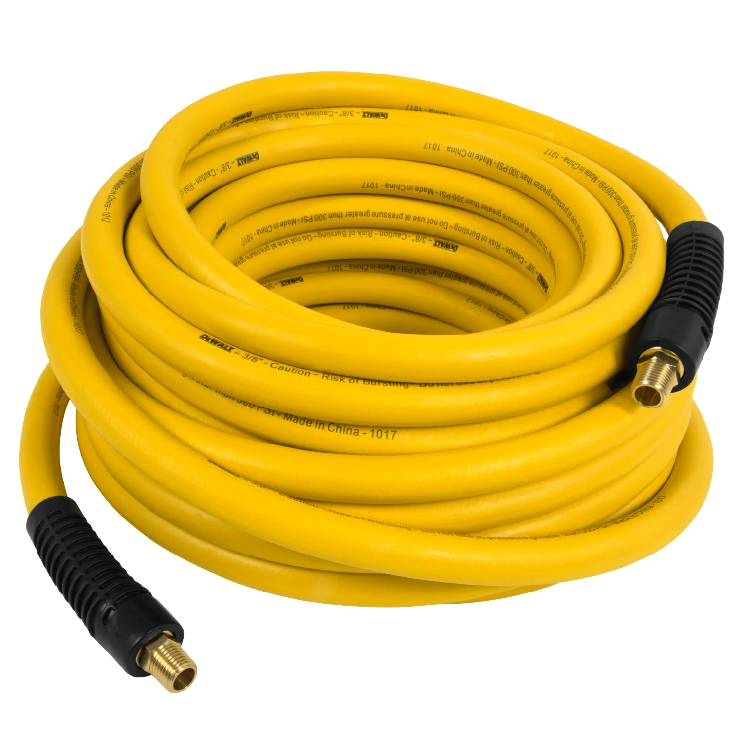 The Dewalt 3/8 in. x 50 ft. premium rubber hose is durable and perfect for all compressor activities. This air hose stays flexible to work with, even at 40°F below zero, yet still takes the heat up to 150°F without swelling or bubbling. The hose is kink and oil resistant under pressure. This rubber hose comes complete with solid brass 1/4 in. NPT male end fittings which never corrode and bend restrictors that prevent hose kinking and reduces wear and tear, prolonging the life of the hose. The Dewalt 3/8 in. x 50 ft. premium rubber hose is the perfect accessory for any air tool and any air compressor that operates at 300 PSI or less.