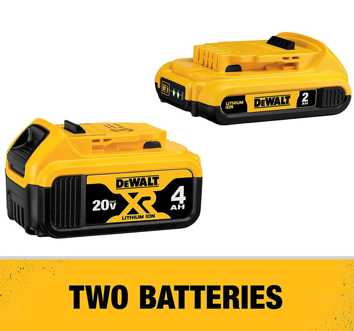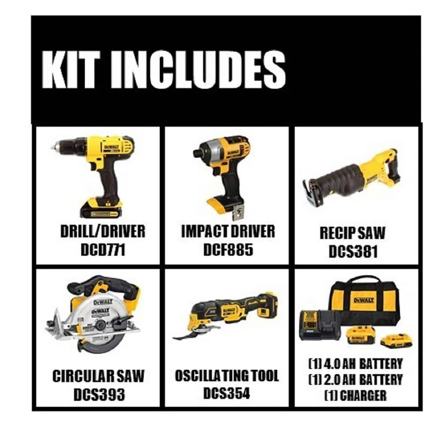 This cordless 5-Tool Combo Kit includes a 1/2-in Drill/Driver, Reciprocating Saw, 6-1/2-in Circular Saw, Brushless Oscillating Multi-Tool, 1/4-in Impact Driver, 20V MAX* 2.0Ah battery, 20V MAX* 4.0Ah battery, charger, and bag. The DCS393 Circular Saw with a 6-1/2-in carbide blade can cut 2x4s at a 45-degree angle in a single pass. The DCS381 Reciprocating Saw with keyless blade clamp allows for quick blade changes. The DCD771 Drill/Driver has a high-speed transmission with two speeds (0-450 and 1,500-rpm) for a range of fastening and drilling applications. The DCF885 Impact Driver has 3-LEDs with a 20-second delay after the trigger is released for increased visibility.