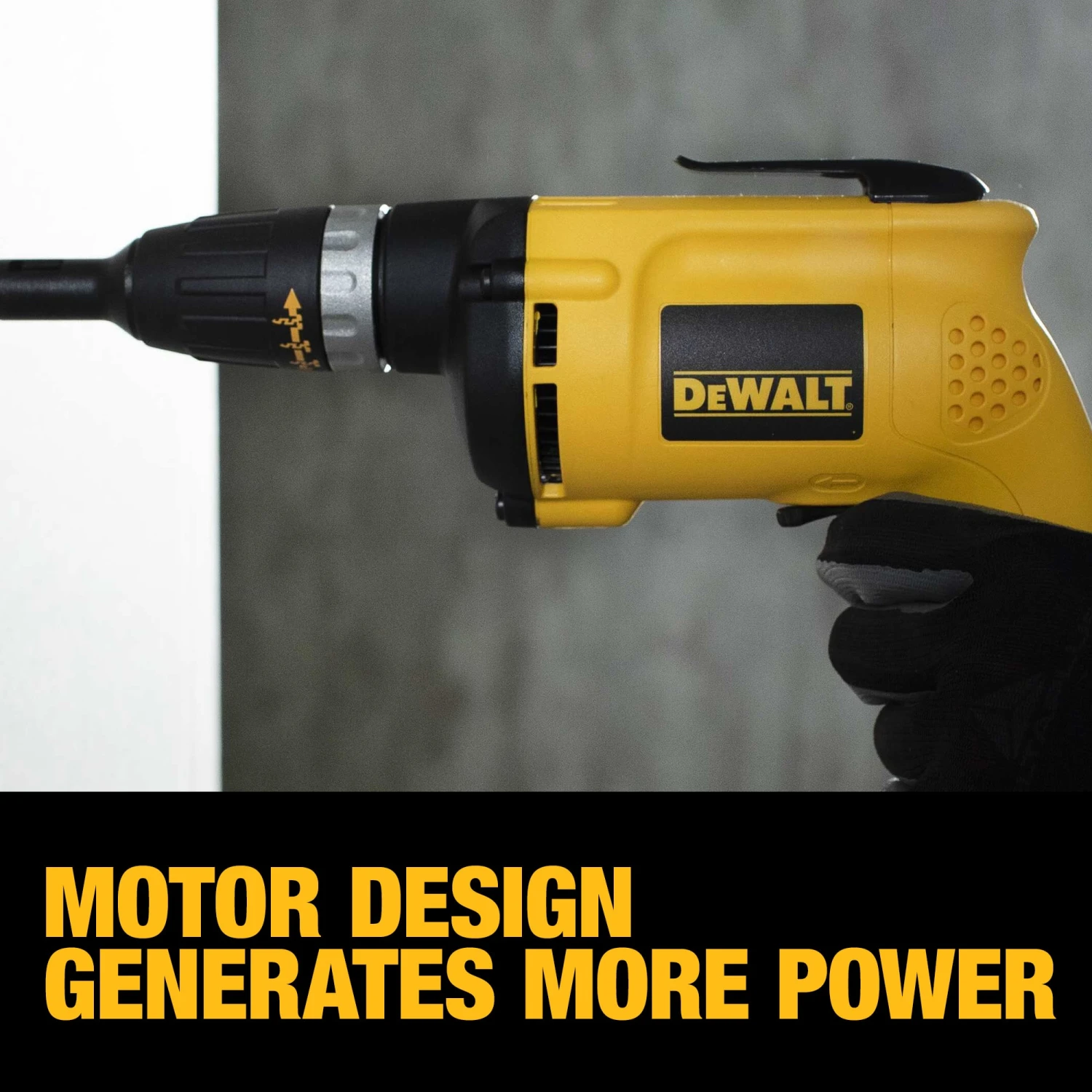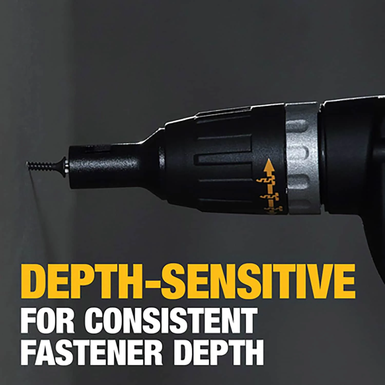 Because the DEWALT® 5,300 rpm high speed VSR drywall screw gun has been extensively tested on real world jobsites, it can live up to your expectations when you need it most. Designed for professional drywall applications, this tool is equipped with a high-speed transmission for production drywall hanging. With a depth-sensitive nosepiece, you can work in confidence that fastener depth will be consistent every time. DEWALT® understands the value of comfort and control on repetitive jobs, so this lightweight drill is equipped with excellent ergonomics, including a rubber grip and two-finger trigger, so you can focus on the job, not on the tool.