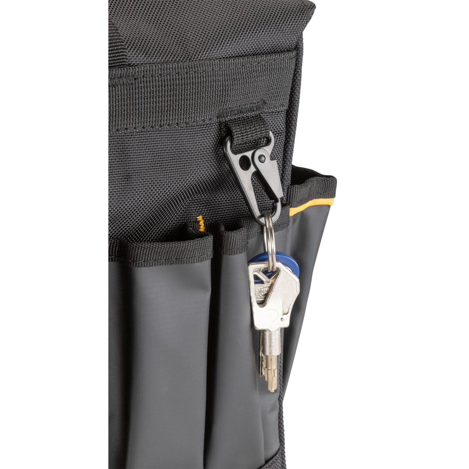 Additional organization – find essentials fast with dedicated straps for your level, a tape clip, and a metal carabiner