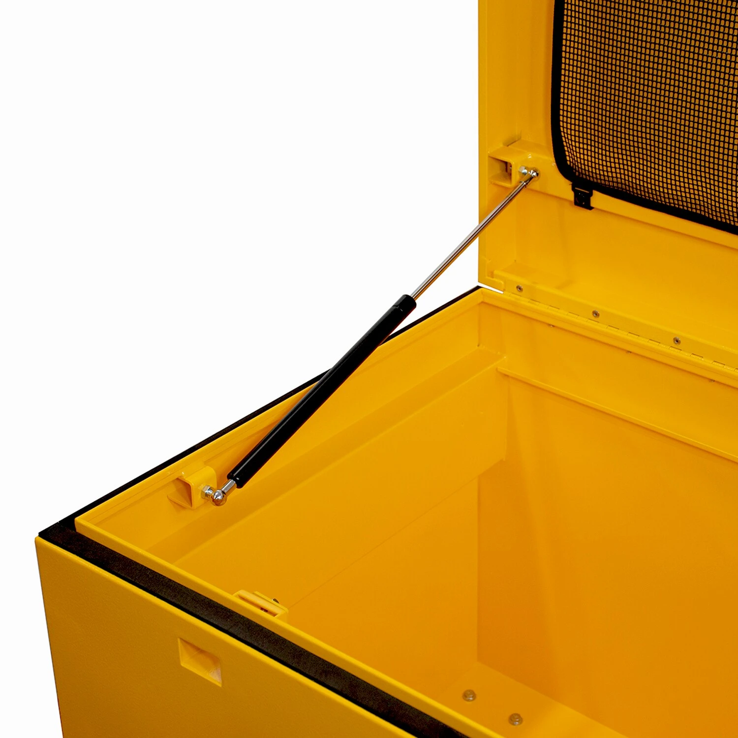 Tough and durable, this DeWalt 36-in job box is designed to withstand the challenging conditions of a construction site. 16-gauge high quality steel construction with UV resistant powder paint finish ensures strength, durability and protection. Features include 2 recessed lock enclosures to keep valuables safe and secure, mechanical lid support and gas struts to assist in lifting and holding the lid open, and a weather-resistant seal around the lid’s edge to protect contents from moisture and dust. An internal tray provides storage for smaller items and a cargo net mounted on the inside of the lid is ideal to protect fragile items. The wide, easy-to-grasp swing-up handles and 7-gauge forklift rails on the bottom allow for easy movement of the box.