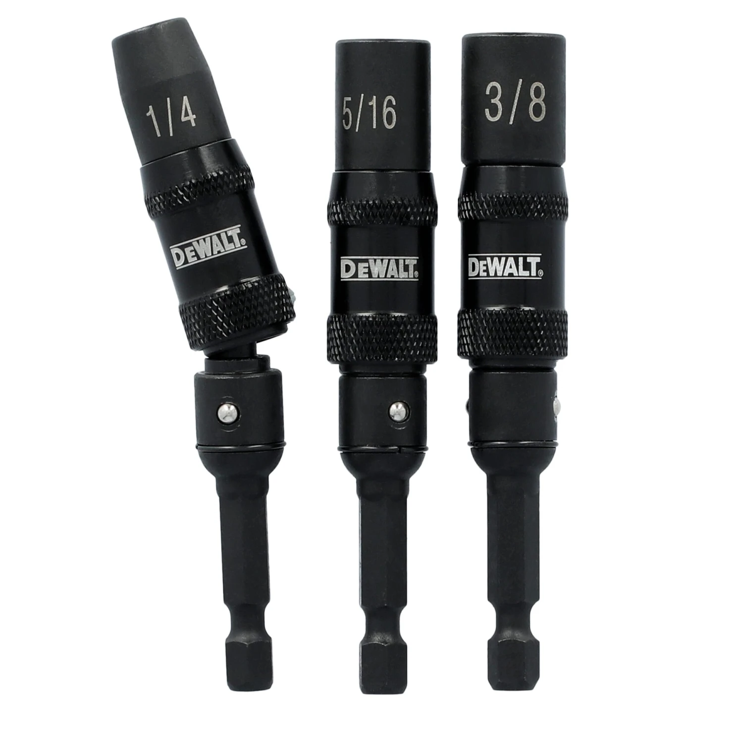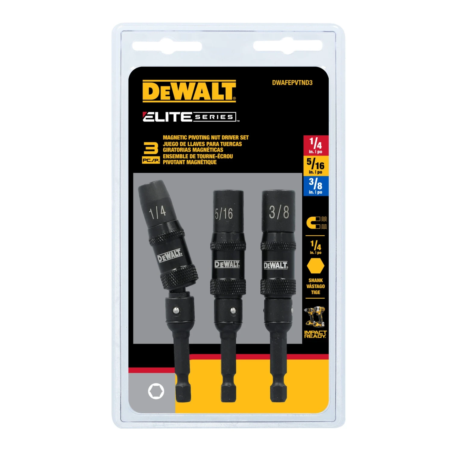 Excellent for tight spaces and corners, DEWALT ELITE SERIES® Pivoting Nut Drivers pivot up to 20 degrees to fit into tight spaces and corners. Recessed corners enable users to drive on flats, minimizing shavings to maintain a clean work area. An industrial-strength magnet of maximizes fastener retention. Designed for use in impact drivers and drills.