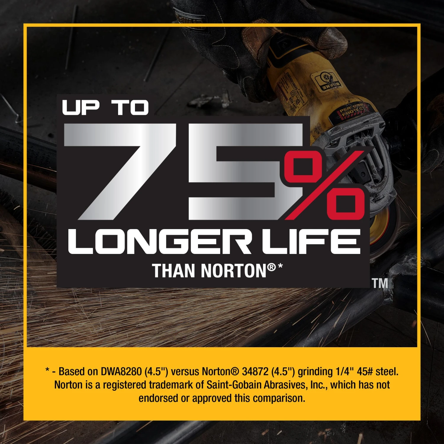 Engineered to Last – High quality ceramic grain allows DEWALT ELITE SERIESâ„¢ DWA8280 Flap Disc to last up to 75% longer than Norton flap disc (Based on DWA8280 (4.5-in versus Norton® 34872 (4.5-in) grinding 1/4-in 45# steel, Norton is a registered trademarks of Saint-Gobain Abrasives, Inc, which has not endorsed or approved this comparison