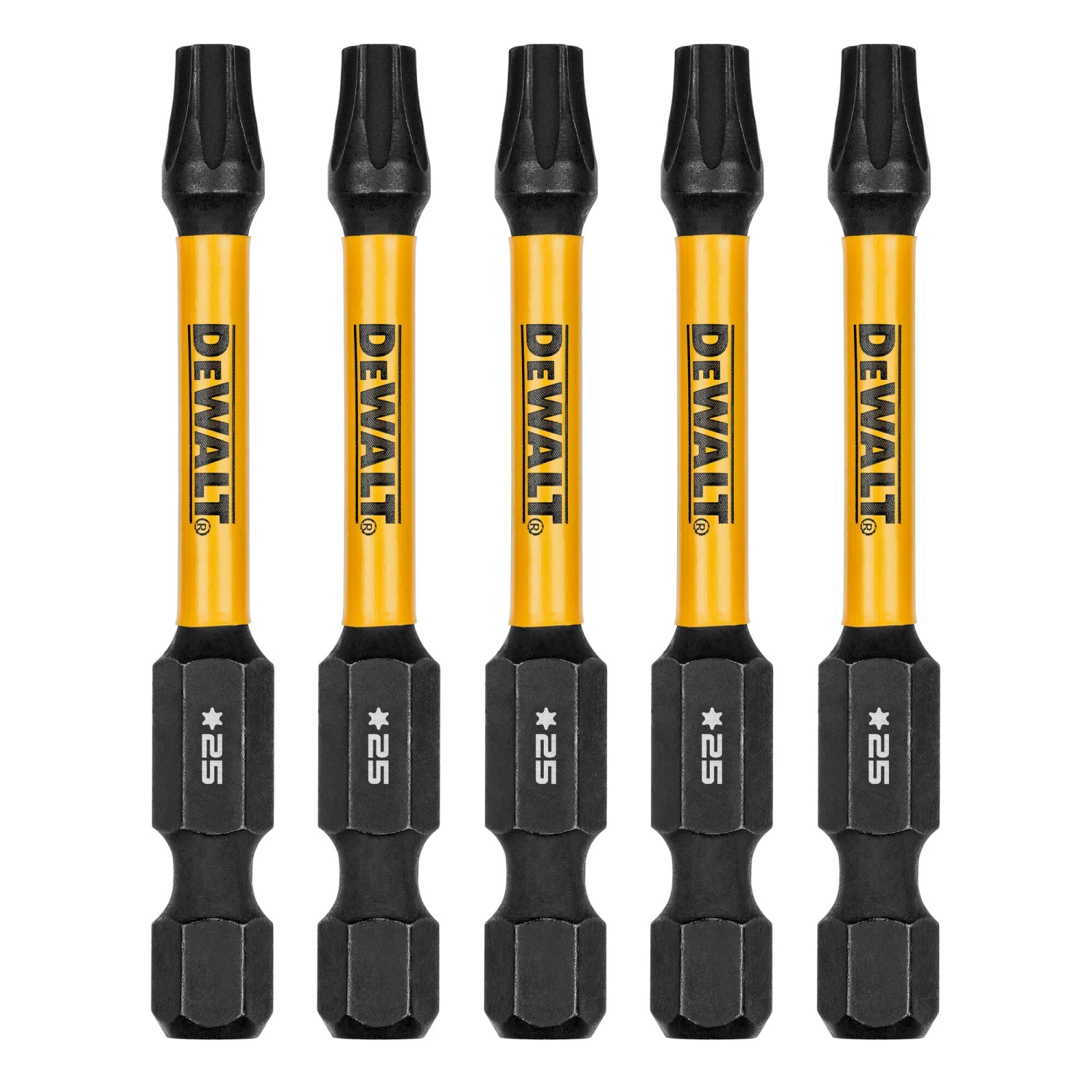 FLEXTORQ® bits are engineered for durability. This latest generation from DEWALT redefines fitment and performance with overhauled tip geometries. The redesigned tip geometries for use with T20(T25 is a trademark of Acument Intellectual Properties, LLC, used without permission to indicate compatibility) size fasteners deliver 4X superior fit, on average, versus previous generation of DEWALT® FlexTorq® screwdriving T25 bits. Every FLEXTORQ® bit features a FLEXTORQ® Zone designed to absorb impact for longer life, on average, versus standard DEWALT® screwdriving T25 bits. Save time and find the right bit with new highly-visible laser-etched size. Each FLEXTORQ® bit is IMPACT READY™ with a ¼-In hex shank for use in impact drivers and drills.