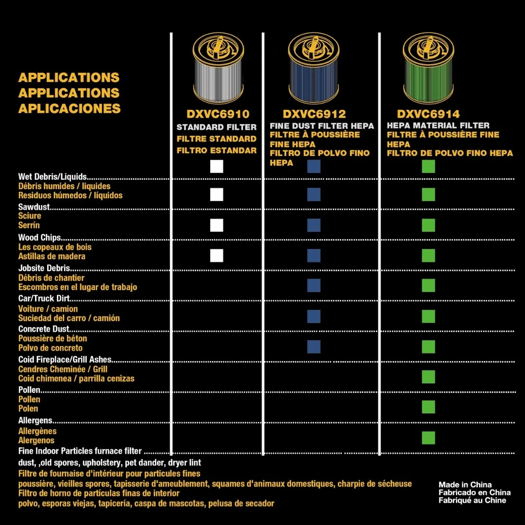 This DEWALT standard cartridge filter fits any of the DEWALT wet/dry vacs between 6-16 gallons. The filter easily connects to the 4 Gallon vacuum with the patent pending clean connect locking system, allowing the filter to be installed safely and securely.