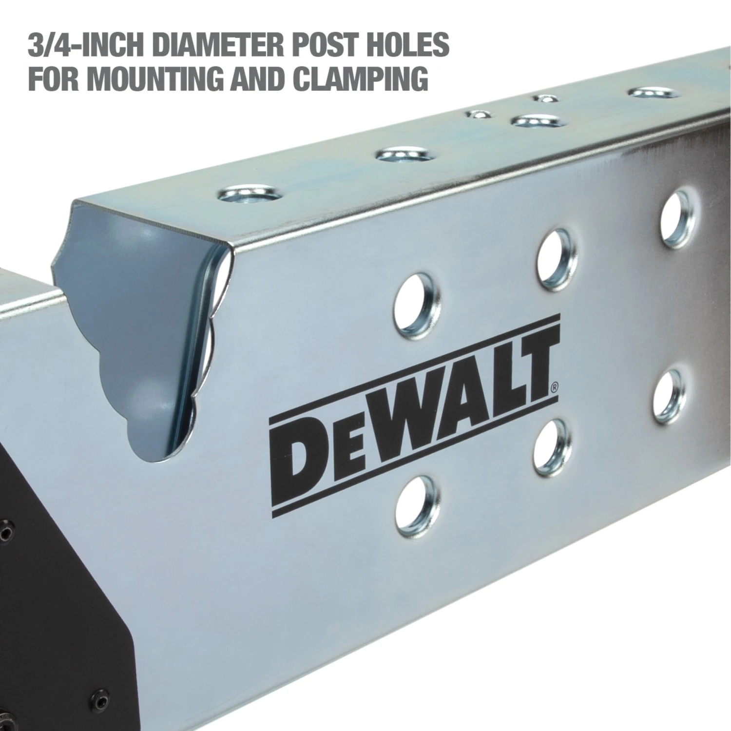 Take your welding to the next level by making it easier than ever to clamp down even the most unruly and awkwardly shaped projects securely in place with this portable DEWALT adjustable height welding sawhorse. This heavy-duty steel welding accessory features a 36-inch wide x 3-inch deep surface with strategically located 3/4-inch diameter holes to provide an array of mounting and clamping points to suit any size project. In addition, two V-shaped and serrated notches provide an ideal place to secure round stock and pipe for welding and cutting. The folding legs are independently adjustable for a sawhorse height of 25 to 33-inches with 1-inch adjustment increments. To prevent collapse under heavy loads, the legs each feature not one but two locking systems to provide maximum stability and an impressive 1,100-pound evenly distributed load capacity. Fold-out material supports on the legs bring added storage for metal stock, bars, and tubes to keep them off the ground and within easy reach. For added versatility, a dedicated grounding stud provides a place for ground clamps and leads to connect that won’t get in the way and a tool holding ring makes a safe place to set welding guns and electrodes between uses. When the welds are done, the sawhorse conveniently folds down into a tight, compact unit with a heavy-duty handle making it easy to transport on to the next job.